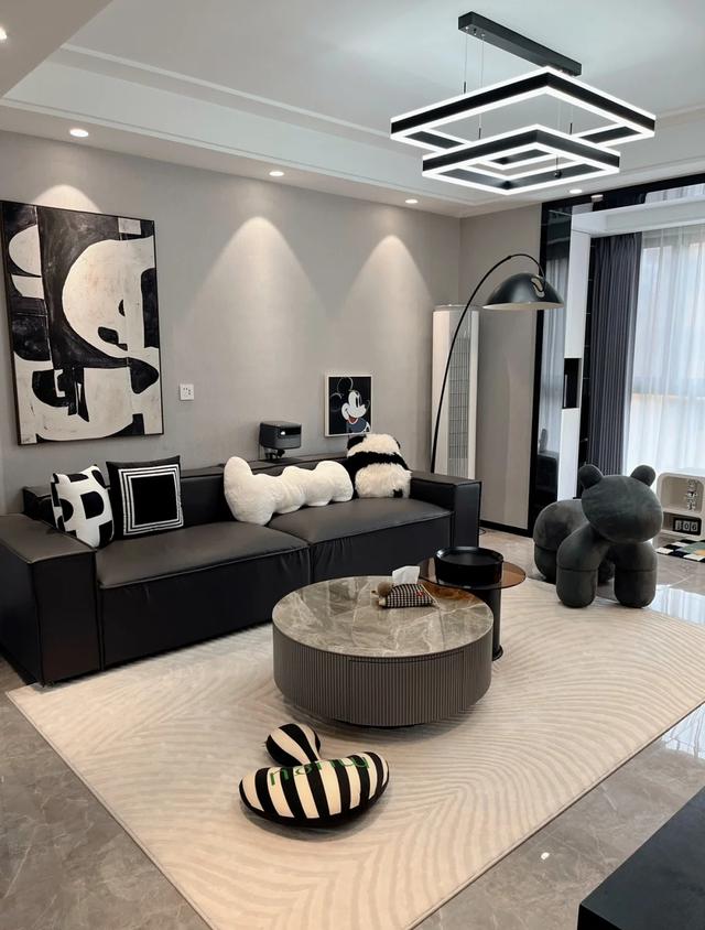 是一个2.8m的黑灰色的直列式沙发,铺着2*2.9m的地毯,中间是一个90的圆形茶几,旁边是一个可爱的小马椅,用来装饰客厅,让它看起来更温馨,更高级。