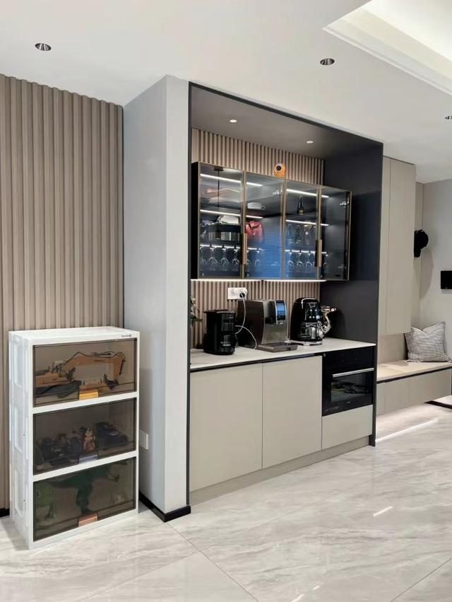 电视背景墙由木质格栅和岩板酒柜组成。每个不同的设计点选择不同的颜色来创建墙壁的立体感。酒柜的加入增加了电视墙的储物能力,整个设计兼顾美观和实用。
