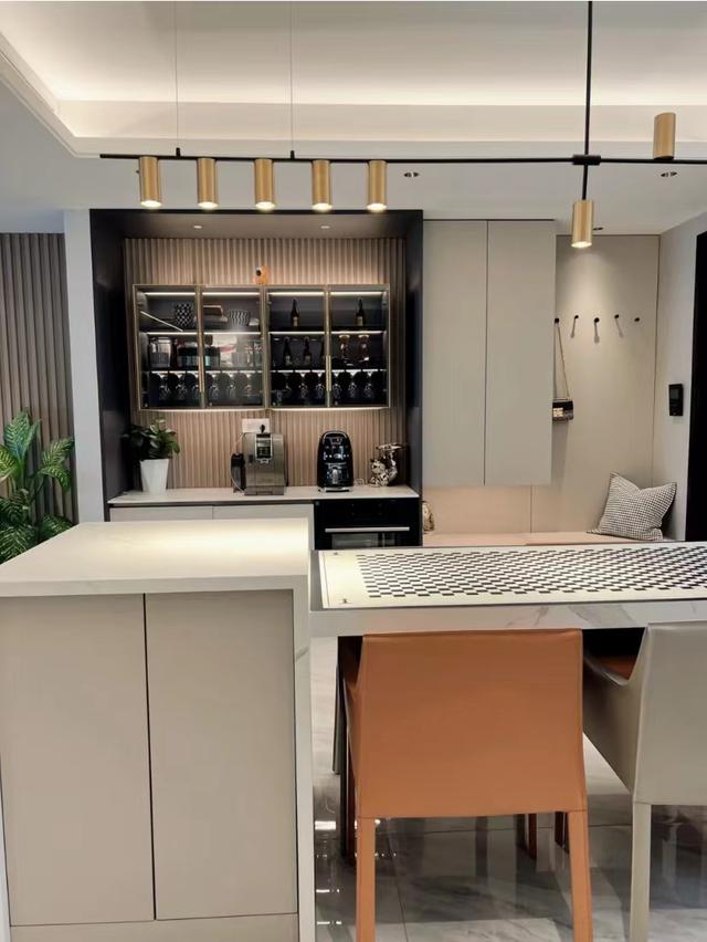 多个空间连接在一起使用的地方,空间感会显大很多。如果放一张普通的6人餐桌,会很浪费空间。如果摆放上一张8-10人的桌子,又感觉没必要。索性做减法,把这里变成岛台一体桌,充分利用空间,做出不同的功能分区。