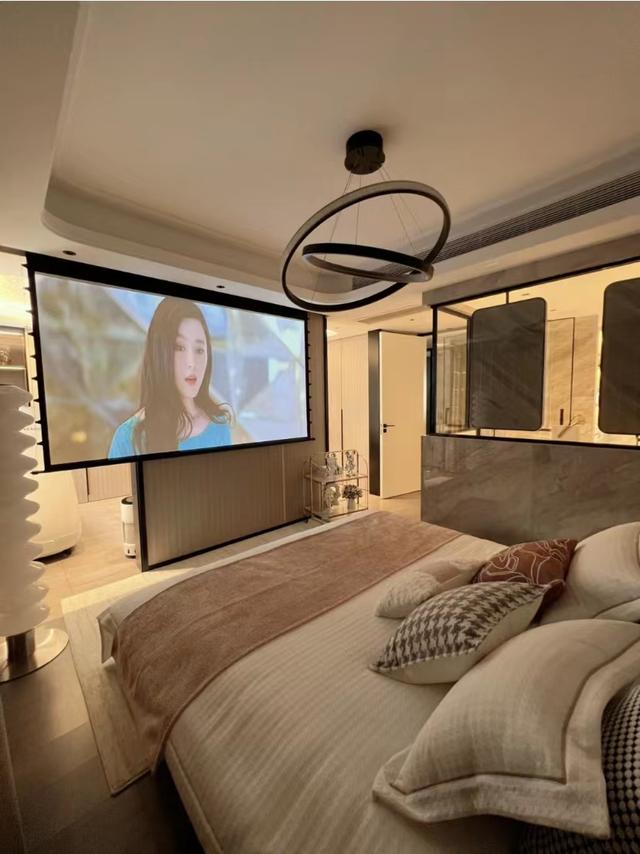 天花板上隐藏设计了一组超大投影屏幕,营造出私人影院的视觉感。
