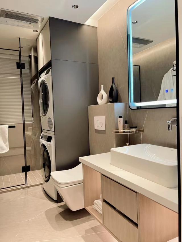 卫生间宽1.5米,长3.3米,只有5㎡。虽然很小,但是女主人装修的时候很用心。干湿分离,合理规划也能装高级。将干衣机组合存放在卫生间中,满足日常洗衣烘干衣物的需求。