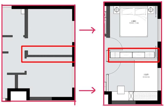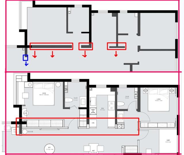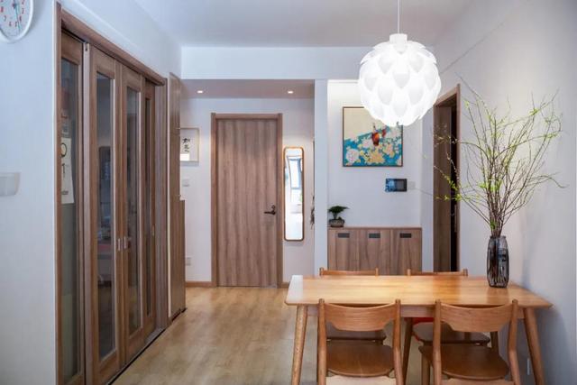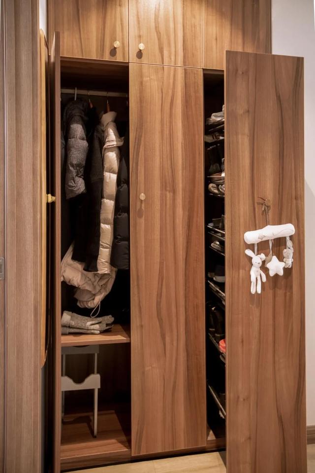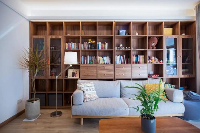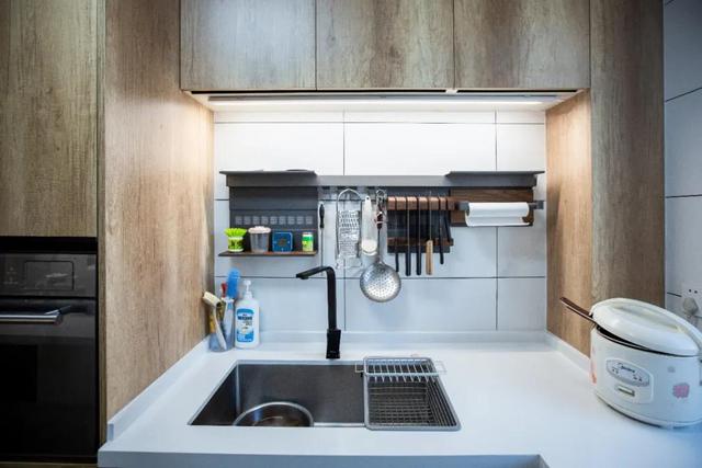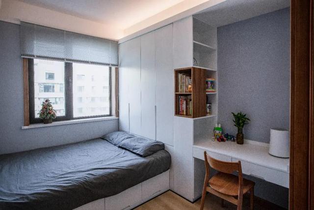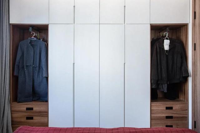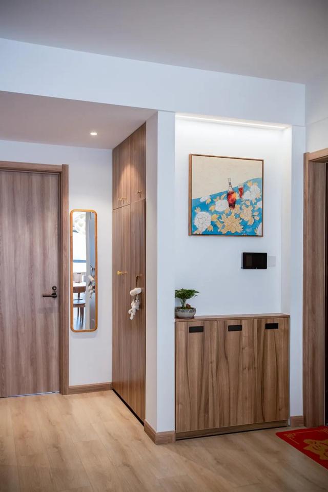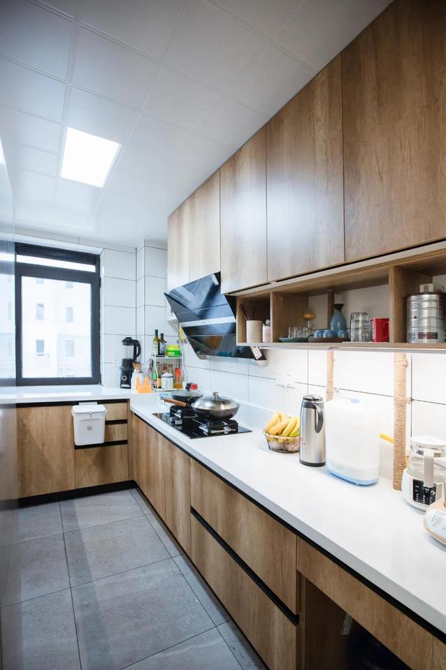 调整玄关旁第二间卧室的入口,为玄关柜腾出空间; 主卧、厨房、卫生间非承重墙更换,移至客厅37cm; 在客厅定制整面书墙,提升房间功能性; 厨房呈U型,橱柜按照“洗、切、炒”的动线设计。