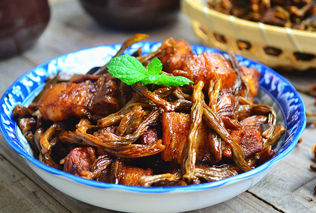 晒干的茄子搭配猪肉,是最美的菜肴,由于茄子已经脱水,所以它不会像嫩茄子一样特别吸油,口感上柔韧入味,一盘菜绝对能吃3碗米饭。