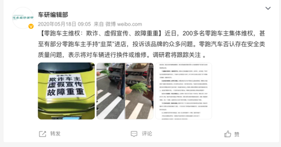 事实上,此次车展维权事件也不是零跑第一次遇到如此严重的公关危机。早在2020年5月,就有200多名零跑车主手持大把韭菜冲入零跑旗下门店维权。据了解,这200多名车主就是零跑S01-380、380PRO的首批车主,他们维权的原因包括了质量缺陷、虚假宣传、误导消费者等问题,也包括了对公司能否保障用户权益、有无后期维保能力的怀疑。而在质量缺陷这方面,也包括了这次车展维权车主遇到的黑屏问题。由此可见,即使过去了2年时间,黑屏问题仍得不到充分地解决。