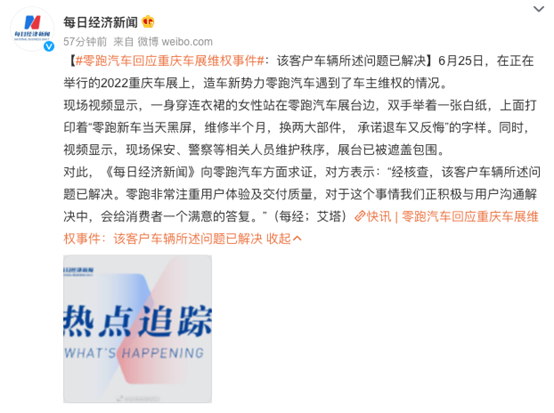 从维权车主双手高举的标语来看,此次车主维权的事由是“提车当天黑屏”、“维修半个月换两大部件”以及“承诺退车又反悔”。而在事发后,零跑汽车官方也表示“经核查,该客户车辆所述问题已解决。零跑汽车非常注重用户体验及交付质量,对于这个事情我们正积极与用户沟通解决中,会给消费者一个满意的答复。”事实上,这样的回复比起最近蔚来过于“冷血”的回复要显得更有温度一些。如果维权女子本人确实是零跑车主的话,倘若不是真的“忍无可忍”,或许也不会直接在车展现场高举标语示威。