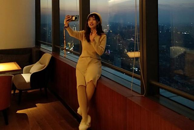 直播调度室设置在苏宁广场43层,主播言语小姐姐正在用手机进行直播↑