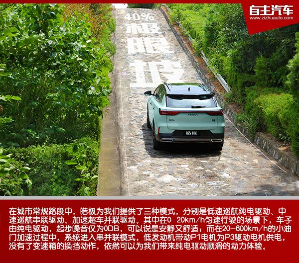 在城市常规路段中,皓极为我们提供了三种模式,分别是低速巡航纯电驱动、中速巡航串联驱动、加速超车并联驱动。其中在0-20km/h匀速行驶的场景下,车子由纯电驱动,起步噪音仅为0DB,可以说是安静又舒适;而在20-600km/h的小油门加速过程中,系统进入串并联模式,低发动机带动P1电机为P3驱动电机供电,没有了变速箱的换挡动作,依然可以为我们带来纯电驱动顺滑的动力体验。