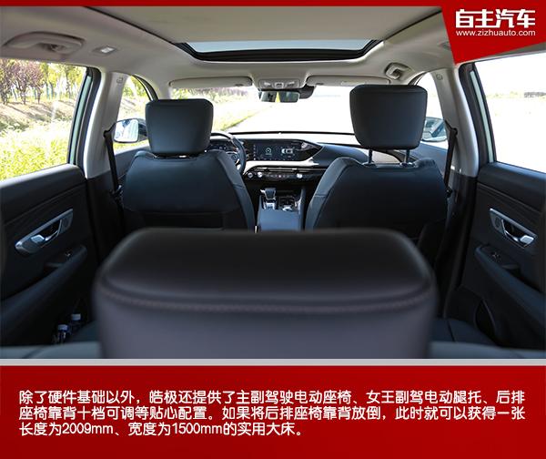 除了硬件基础以外,皓极还提供了主副驾驶电动座椅、女王副驾电动腿托、后排座椅靠背十档可调等贴心配置。如果将后排座椅靠背放倒,此时就可以获得一张长度为2009mm、宽度为1500mm的实用大床。