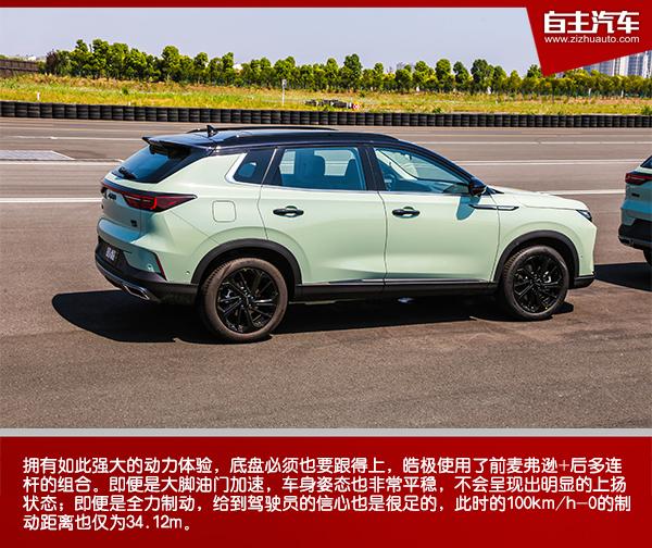 拥有如此强大的动力体验,底盘必须也要跟得上,皓极使用了前麦弗逊+后多连杆的组合。即便是大脚油门加速,车身姿态也非常平稳,不会呈现出明显的上扬状态;即便是全力制动,给到驾驶员的信心也是很足的,此时的100km/h-0的制动距离也仅为34.12m。