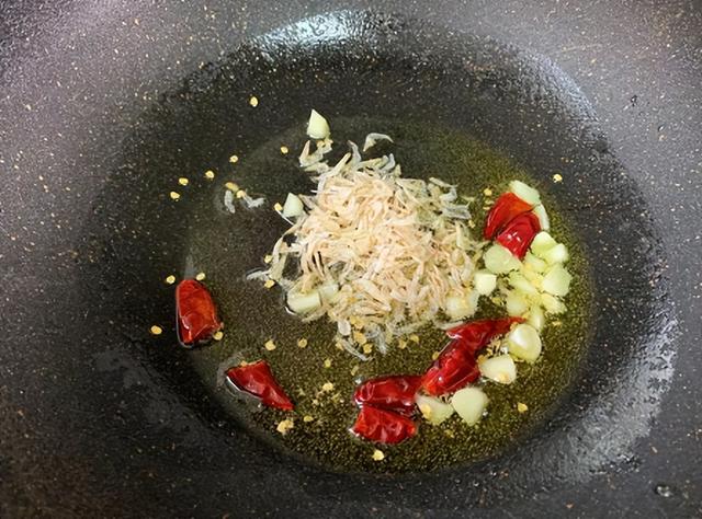 2、锅中倒油,放入大蒜、干红椒、虾皮炒香。