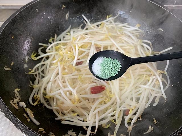 3、然后下入绿豆芽大火翻炒,炒至断生之后,加盐、鸡精、香醋、少许白糖提鲜,饭后翻炒均匀。
