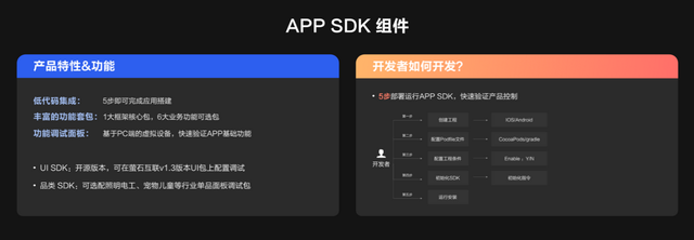 其次在APP开放能力上,面向开发者,萤石提供了APP SDK的组件化能力,通过整合核心框架能力,高度封装业务接口,以1个核心接入包,外加配网、消息、家庭、智能、推送、调试等6大可选组件包供开发者自助选配开发调试,同时也开源了公版的UI组件和品类面板,满足开发者的定制化需求和场景。
