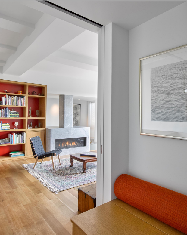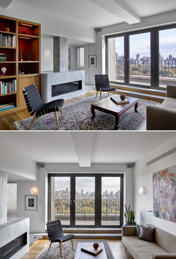 翻新后的客厅包括燃气壁炉和由SMC石材环绕的浅灰色石材。作为白色客厅的底色,让整个房间通透自然。整个现代家具被用来使客厅时尚优雅。沙发没有过多的装饰,白色可以随意换。