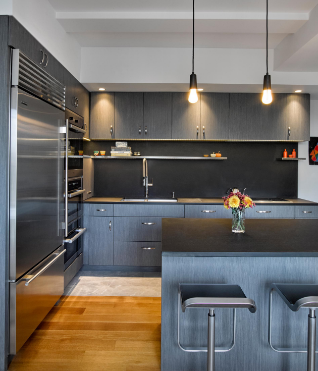 改造后的厨房布局新颖,中间是岛式平台,增加了操作空间,也是餐厅和厨房的完美过渡。这里的厨房电器都是嵌在橱柜里的,位置固定,所以空间井然有序!