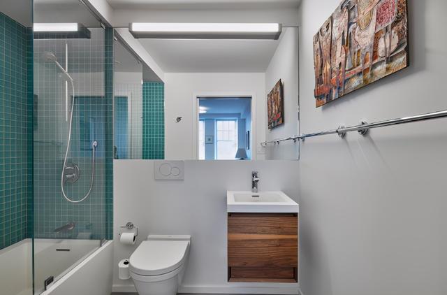 改造后的卫生间延续了整体风格,以白色为底色,木质元素,干净清爽的蓝绿色格子砖。整体效果简洁舒适。
