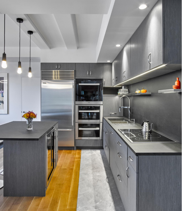 直板柜好用,配合岛式平台,动线非常清晰简洁。背景采用高级浅灰色,每个操作上方都有一个LED聚光灯,可以照亮每个操作空间。