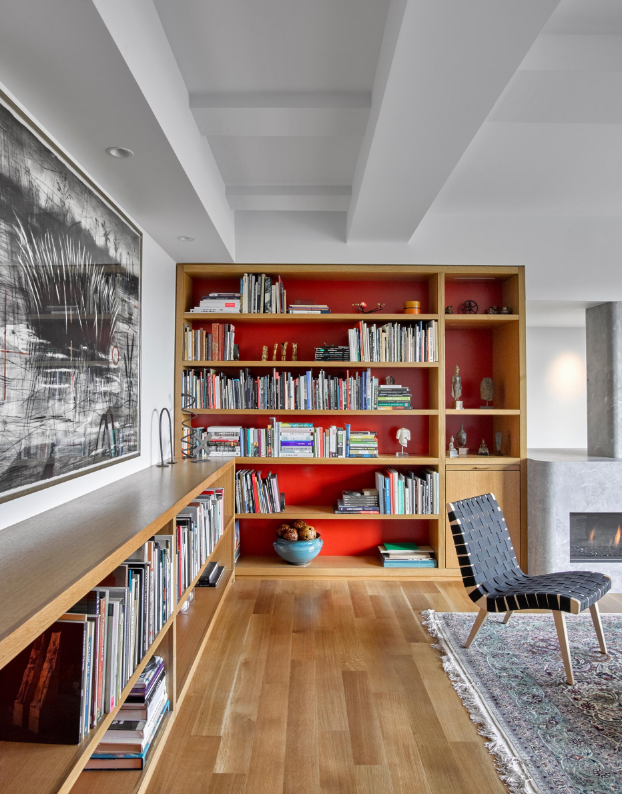 你第一眼看到的书柜,是红色原木色的定制橱柜,一致延伸到客厅的整排收纳柜,既增加了收纳空间,又延伸了空间,