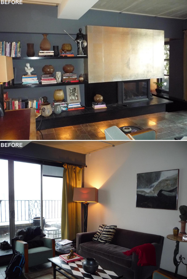 原来的客厅电视墙刷成了灰色,嵌入了漂浮的储物格,看起来有点乱。在壁炉上方再加一个金属装饰,现在看来也没什么用了。有一些鸡肋。