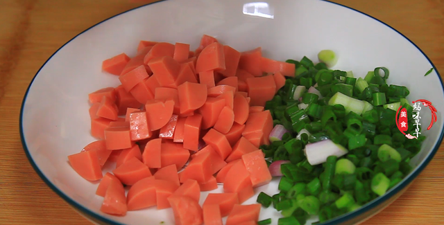 1、首先准备适量小葱清洗干净,然后将小葱切成葱花备用,一根火腿肠先切成长条,然后再切成小丁备用,切好后和葱花放在一起。