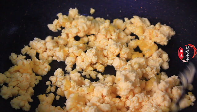 4、如果有比较大的疙瘩,用铲子把它压碎一些,炒到全部是小疙瘩的时候就可以调味了,加一勺盐、一勺鸡精,再倒入葱花和火腿,大火翻炒,把葱花和火腿炒出香味。