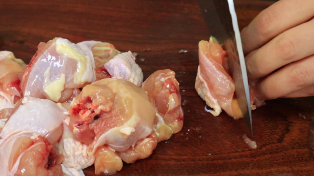 1、首先我们准备3-4个鸡腿,清洗一下剁成块,剁好之后再切成小块,不过也不能切得太小,那样口感不好。