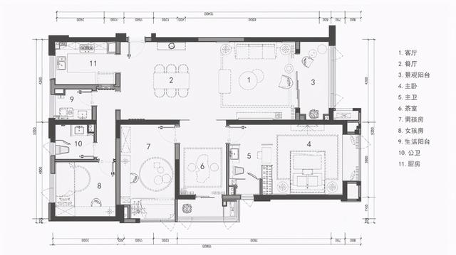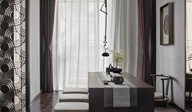 客厅、餐厅、茶室形成一个公共区域,各种镂空屏风作为隔断。典雅的中式家具与简约硬装的家具相互呼应,营造豪华大气的家!