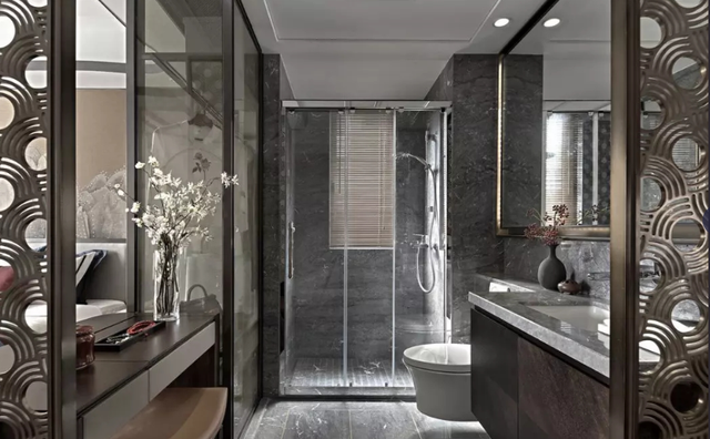 对称的设计还在继续,两边镂空的隔断贯穿整个房子,大理石在这样的氛围中变得优雅庄重!