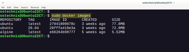 REPOSITORY                TAG       IMAGE ID       CREATED          SIZEostechnix/ubuntu_apache   latest    bc5e5f95ca59   14 minutes ago   229MBdebian                    latest    d2780094a226   11 days ago      124MBubuntu                    latest    27941809078c   3 weeks ago      77.8MBubuntu                    20.04     20fffa419e3a   3 weeks ago      72.8MBalpine                    latest    e66264b98777   5 weeks ago      5.52MB