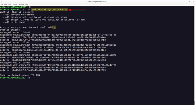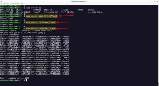 WARNING! This will remove all stopped containers.Are you sure you want to continue? [y/N] yDeleted Containers:397111fac5374921b974721ee646b2d5fbae61ca9c6e8b90fbf47952f382a46b80b53b7e661d33696b65c78267fc3f067b6100799c925910db4721963e3fae0a[...]Total reclaimed space: 176B