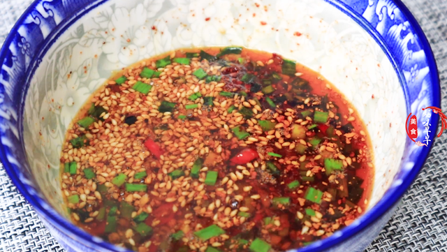 5、平底锅里多倒一些油,油热之后放入一小撮花椒,中火炒出香味,炒香之后,直接淋在料碗里面,加入一勺香醋、两勺生抽,一勺蚝油,一勺食盐,一勺白糖,适量的香油,搅拌均匀备用。