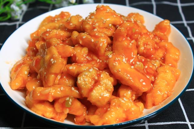 8、接下来咱们就开始炒了,锅烧热倒入调好的糖醋汁,大火翻炒,将料汁炒到粘稠,然后淋入熟油和切好的配菜,翻炒出香味,这样炒出的里脊肉颜色比较油亮,最后倒入炸好的鸡肉大火翻炒均匀就可以出锅了。