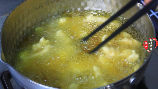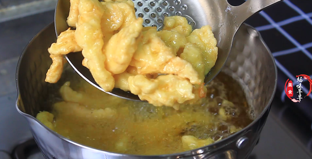 7、油温6成热下入鸡肉,别全部倒进去,那样就黏在一起了,中火慢炸,第一遍先把鸡肉炸熟,颜色微微发黄就可以捞出了,接着把油温升到7-8成热,然后下入鸡肉继续炸制几秒钟,表皮金黄酥脆就可以捞出。