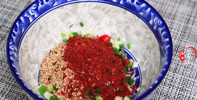 4、小葱切成葱花,小米椒切成圈,大蒜剁成蒜末,切好装入碗中,接着开始调味,加入一勺白芝麻,一勺辣椒面。