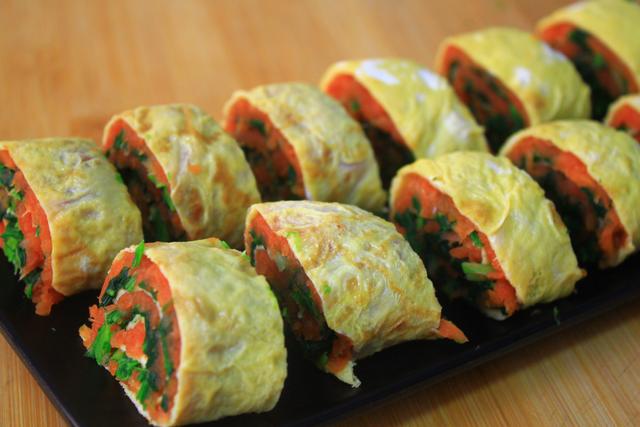 4,将胡萝卜泥均匀地涂抹在鸡蛋饼上,然后再把菠菜碎铺在胡萝卜上面,用勺子压得紧实一些,然后从一头慢慢地将鸡蛋饼卷起来。卷好后切成小块装盘。