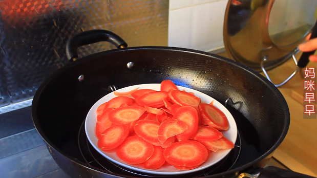 1,胡萝卜洗净去皮切成薄片,然后上锅蒸熟,切的薄一些蒸的比较快一些。蒸熟以后趁热把胡萝卜捣成泥。