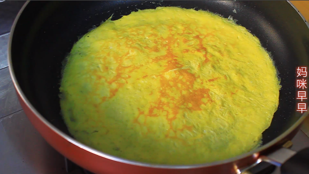 3,碗里打入3个鸡蛋,加入一小勺盐,搅拌均匀。接着在平底锅里刷上一层油,油热后舀两勺鸡蛋液,快速转动锅,摊成一个鸡蛋饼。