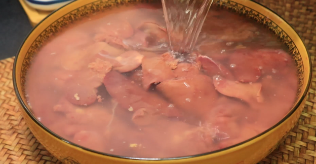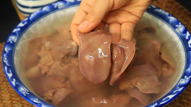 3、泡好的鸡肝颜色没那么鲜红,说明析出了血水,这样做出的鸡肝才会丝毫没有腥味。