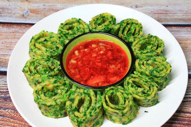 第四步,出锅后将韭菜饼卷起来,切成块装盘就可以吃了。