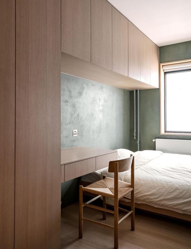 次卧空间也是以大面积的橡木元素为基础,定制衣柜、书桌、床,满足主人在家的偶尔需求。