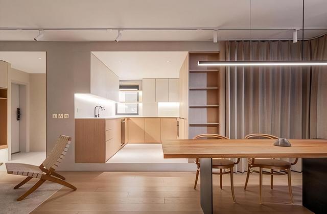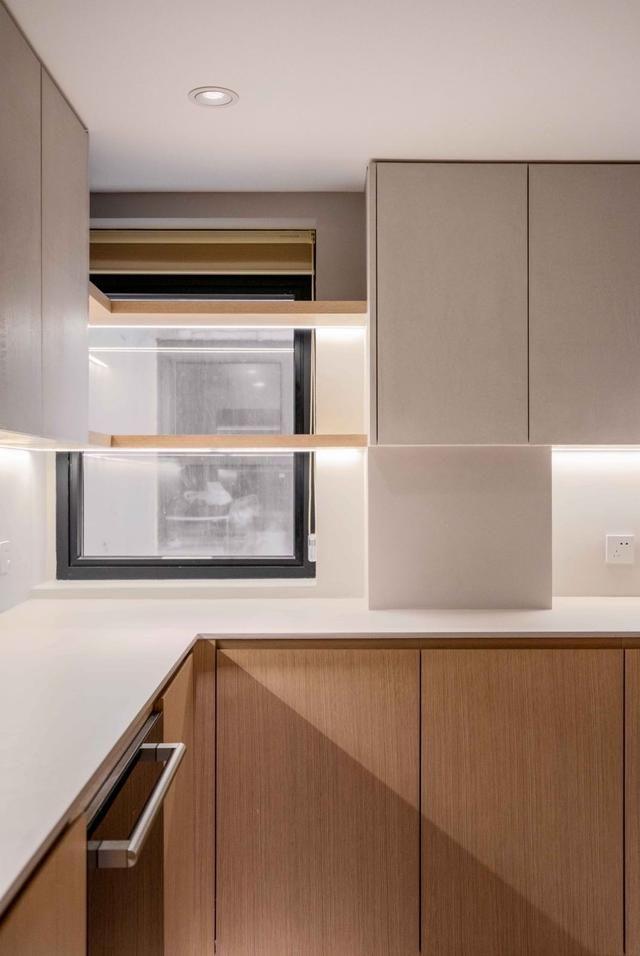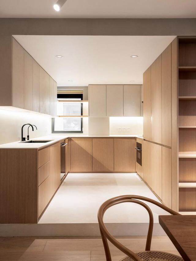 同时沿橡木彩板使用地柜和高柜,小厨房也有温馨自然的氛围。