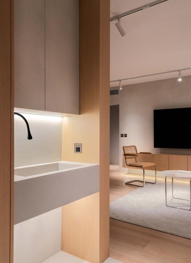 墙面采用灰色哑光艺术漆,地面以浅灰色千分尺为主。从墙壁到地面,似乎有一种无缝的视觉感。
