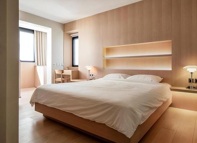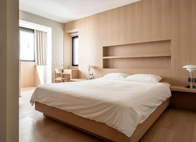 橡木皮的墙面采用了大面积的木色,让主卧空间有了一种自然的清新感。同时,床头两侧设置了加长的隔断桌。没有多余的装饰,但是看起来特别精致。