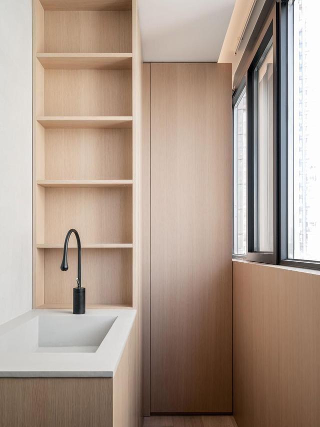 甚至在洗涤池的上方,做了一部分收纳,做了层层隔断,方便存放一些日常洗涤用品。