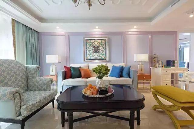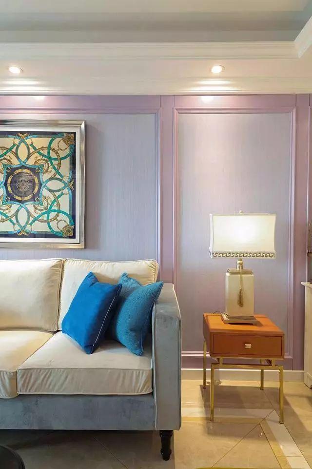 客厅沙发背景墙用粉紫色护墙板装饰,蓝灰色+米白色绒面沙发,优雅大方。