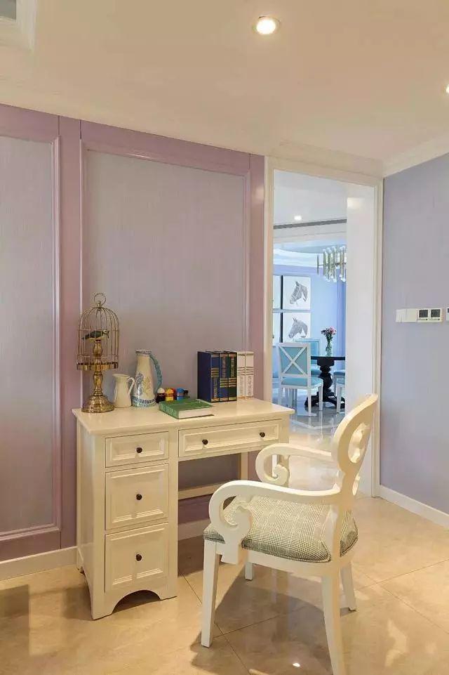 沙发背景墙还有空间,摆放一套书桌椅,桌上摆放铜制鸟笼装饰,成了一个精致的小书房空间。