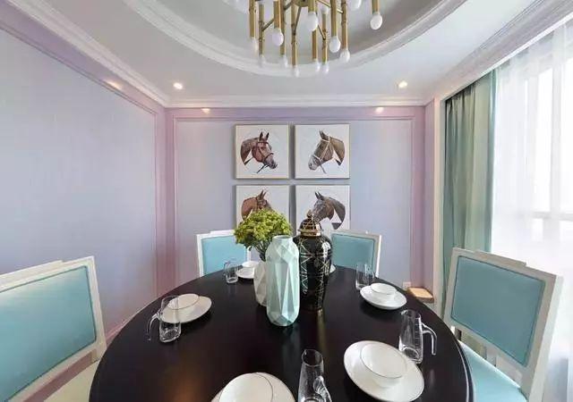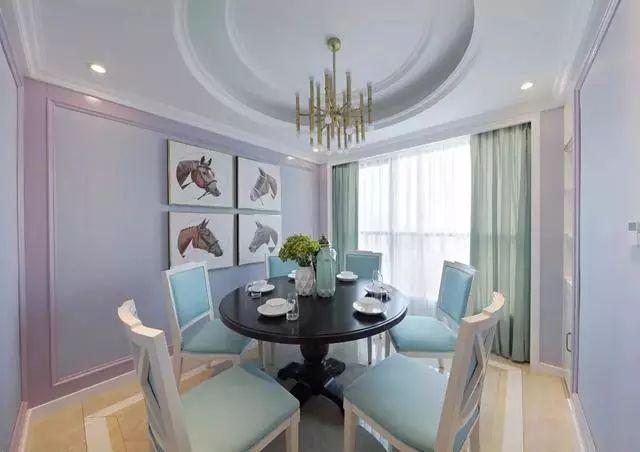 餐厅的空间延续客厅沙发背景墙的装修风格,圆形的吊顶和圆形餐桌相互呼应,浅蓝色餐椅搭配,给人清新舒适的用餐感受。