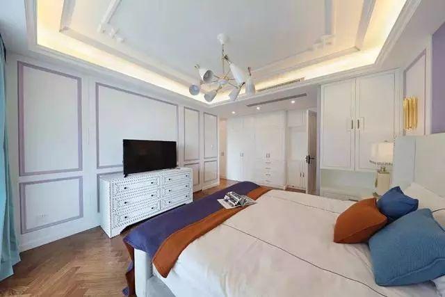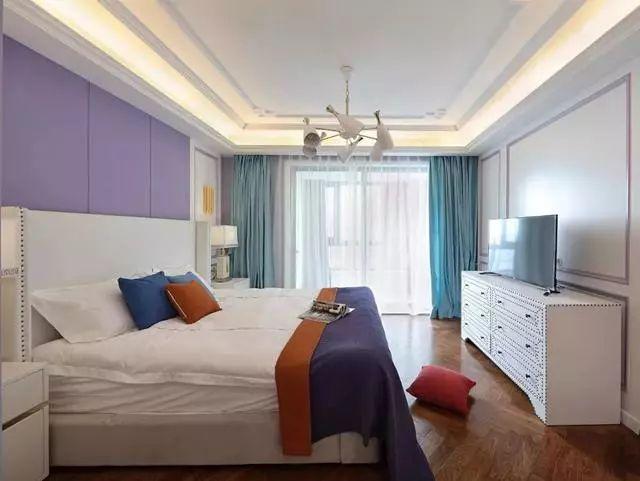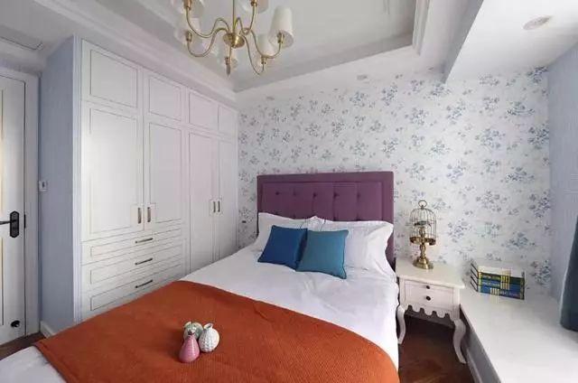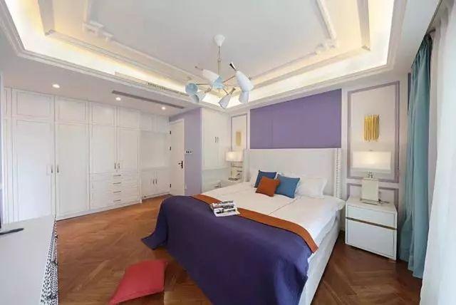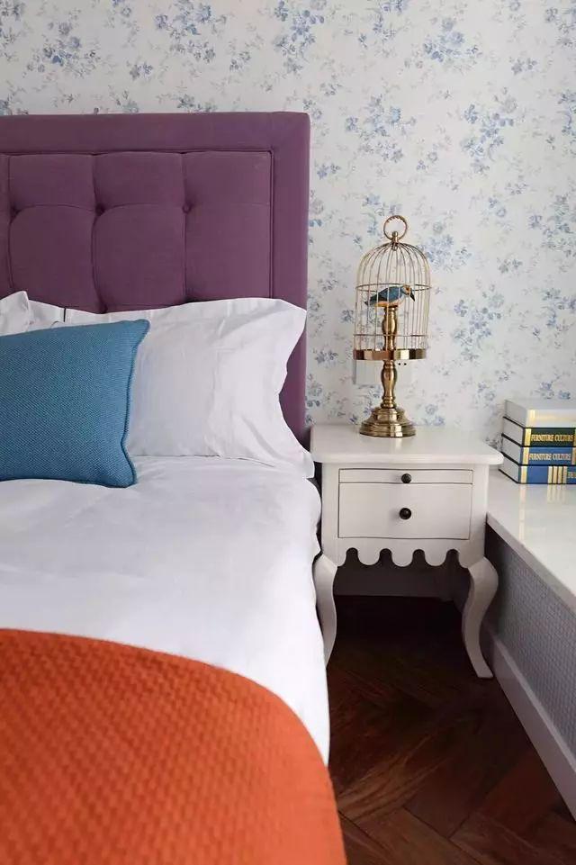 浅紫色是卧室的主色调,加入深蓝、橙色等颜色,浪漫之中又带有静谧感。