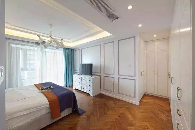 卧室用人字形拼接木地板装饰,脚感更加舒适,更适合卧室的装修设计。