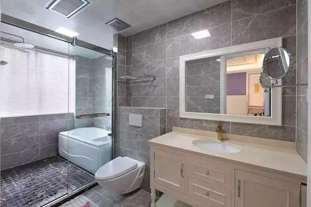 主卧电视背景墙的后面是主卫,卫生间采用干湿分离设计,壁挂式马桶上方做收纳,实用性超强!