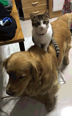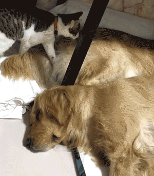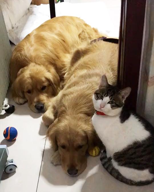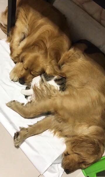 猫是喜欢温暖的动物,躺在大金毛们温暖的身躯间,靠着他们柔软的背部,对于慵懒的它来说,再舒服不过了!